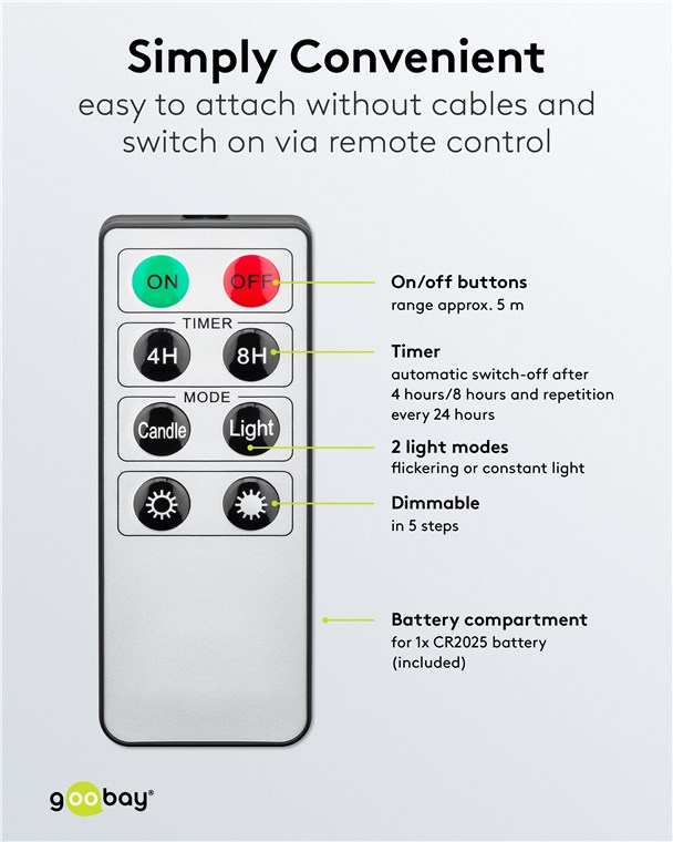 - Świece na baterie: 1x AAA każda (brak w zestawie), pilot: 1x CR2025 (w zestawie)