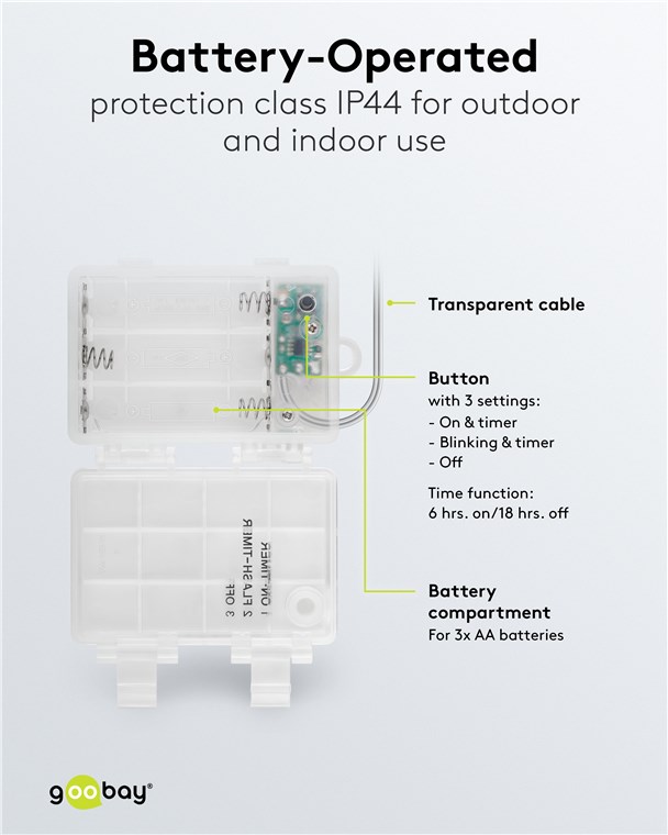 - z funkcją timera: 6 h włączania/18 h wyłączania, przełącznik w 3 pozycjach: stałe światło/czasomierz, miganie/czasomierz, wył.