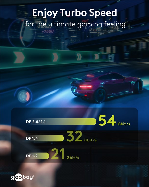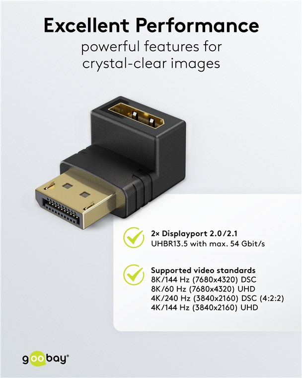 Dzięki ultrawysokiej rozdzielczości obrazu 8K zapewniającej ostry jak brzytwa obraz i funkcji wielu monitorów o wysokiej częstotliwości, adapter DisplayPort™ jest idealnym wyborem do wciągających gier i wciągającej domowej rozrywki. Adapter zapewnia szczególnie wysoką szybkość transmisji danych z UHBR13.5 dla lepszej obsługi HDR, a tym samym większą głębię kolorów i ostrzejsze kontrasty.