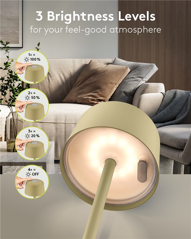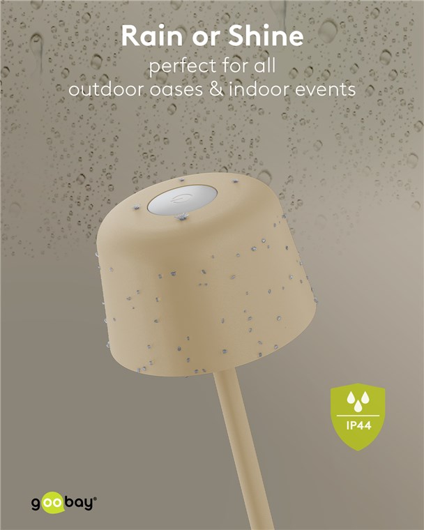 - Dzięki ochronie przed bryzgami wody (stopień ochrony IP44), lampa stołowa jest również idealna na patio, balkon lub do ogrodu