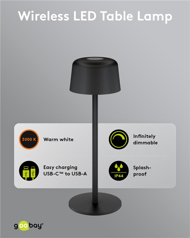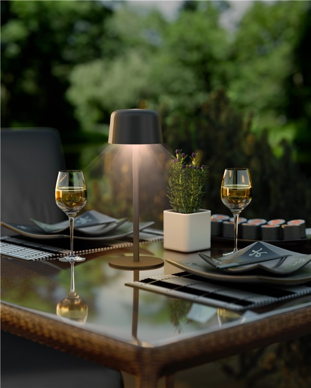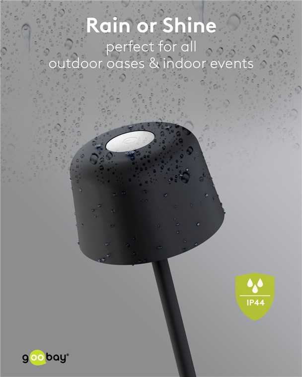 • Dzięki ochronie przed bryzgami wody (stopień ochrony IP44), lampa stołowa jest również idealna na patio, balkon lub do ogrodu