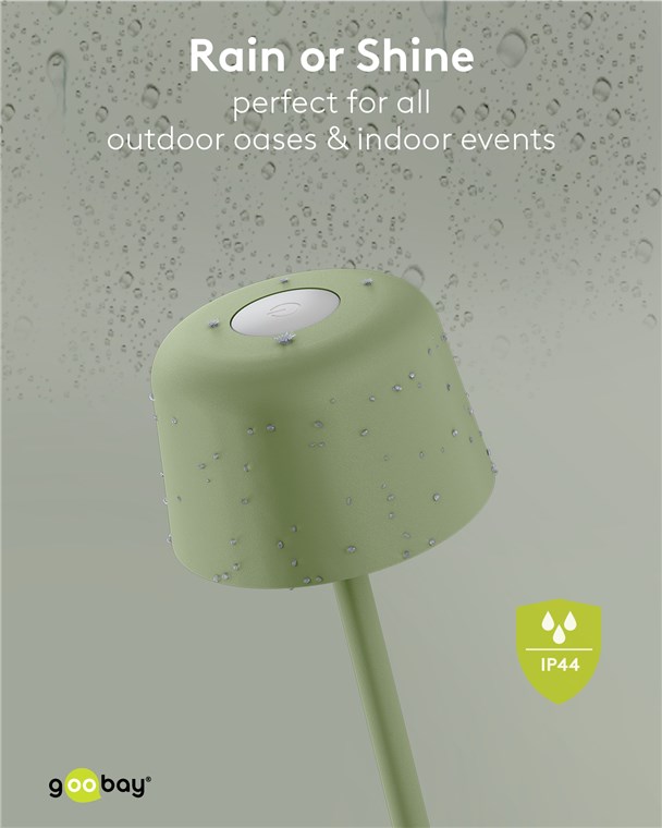• Dzięki ochronie przed bryzgami wody (stopień ochrony IP44), lampa stołowa jest również idealna na patio, balkon lub do ogrodu