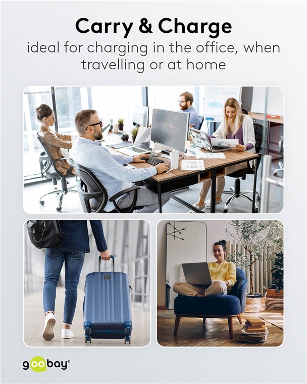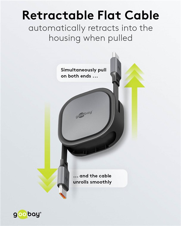 - Rozciągliwy, płaski kabel USB-C™ do ładowania w kompaktowej obudowie, idealny do transportu w torbie bez splątanych kabli lub ich przerwania