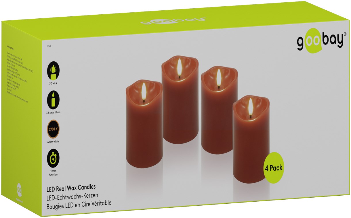 - Cztery świece filarowe w tym samym rozmiarze z płomieniem 3D dla ciepłego światła świec z naturalnie wyglądającym, migoczącym płomieniem – całkowicie elektryczne i całkowicie bezpieczne