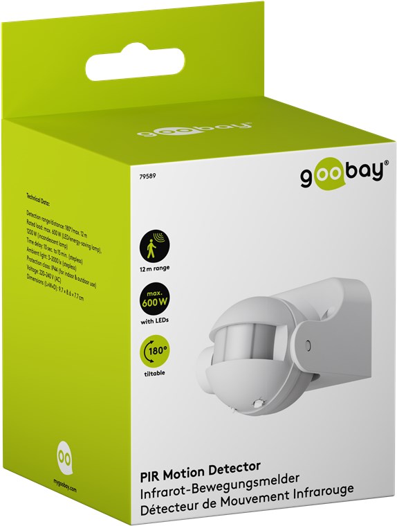 Wiatr i pogoda? Nie ma problemu, czujnik ruchu o stopniu ochrony IP44 idealnie nadaje się do zastosowań zewnętrznych, takich jak ogród, wiata garażowa lub wejścia do domu. Wystarczy podłączyć go do oświetlenia zewnętrznego lub ścieżki, aby uniknąć potknięć o zmierzchu i w ciemności. Czujnik ruchu Goobay – z pewnością dobre samopoczucie.