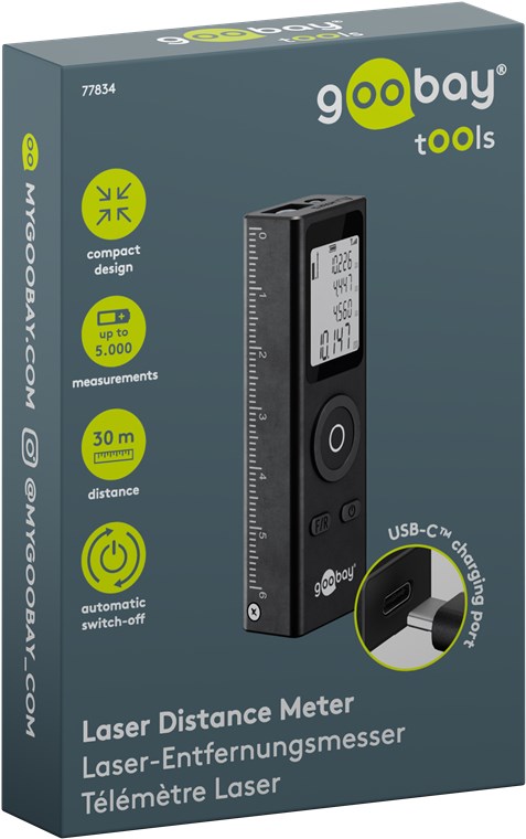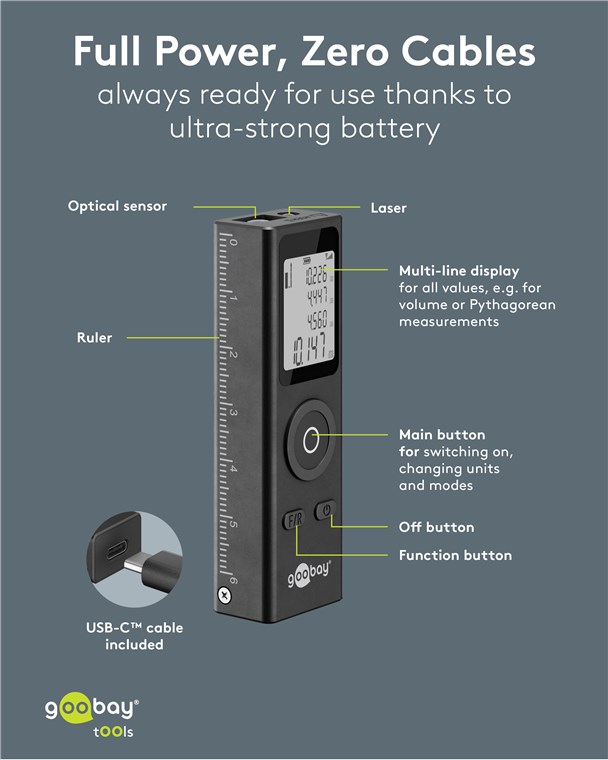 - W zestawie kabel ładujący 30 cm (USB-C™ do USB-A) i pasek na rękę ułatwiający obsługę miernika laserowego