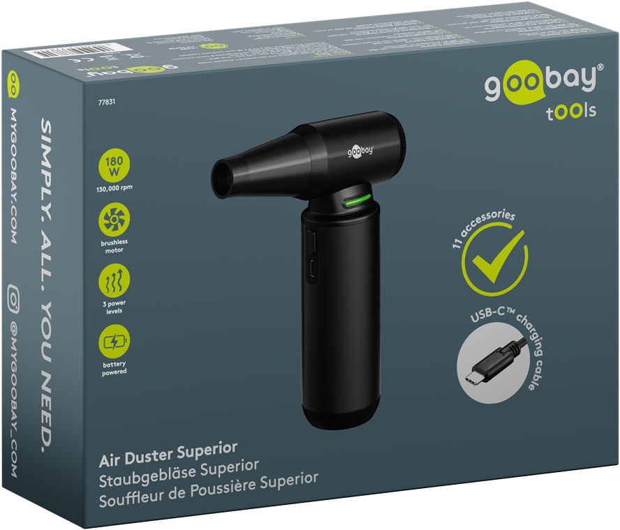 Huragan wśród dmuchaw: z prędkością 130 000 obr./min jest to najmocniejsza dmuchawa do kurzu w asortymencie i najlepsze rozwiązanie do czyszczenia klawiatur, usuwania sierści zwierząt i nadmuchiwania materacy dmuchanych. Bezprzewodowa i wielokrotnego ładowania dmuchawa jest bardziej praktyczna i ekonomiczna niż sprężone powietrze w puszce.