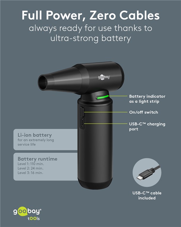 - Ekologiczny w podróży: Dzięki akumulatorowi ładowalnemu dmuchawa jest znacznie bardziej ekologiczna niż spray z puszki i dlatego jest szczególnie praktyczna w podróży
