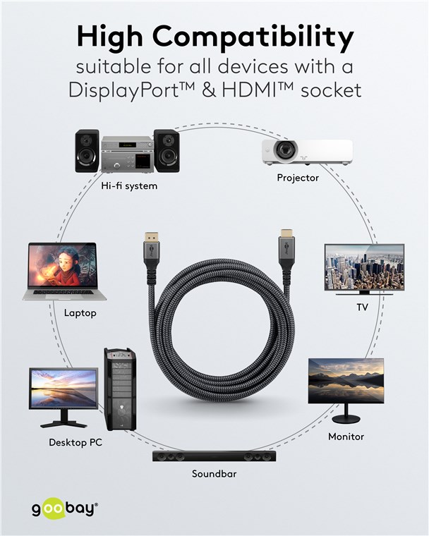 - Kabel zapewnia rozdzielczość Ultra HD do 8K @ 50/60 Hz i szybkość przesyłania danych do 48 Gbit/s z DisplayPort™ 2.0/2.1 i HDMI™