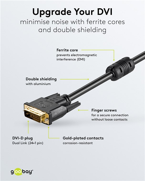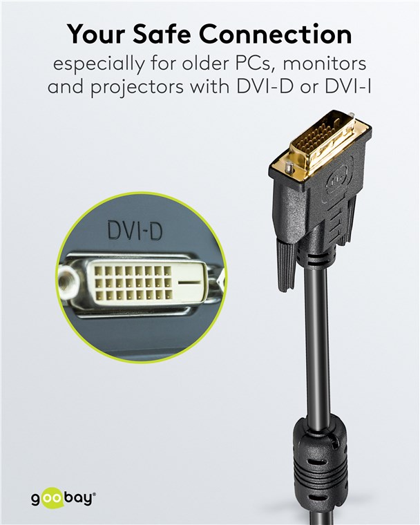 • Kabel DVI-D Dual Link (24 + 1 pin) firmy Goobay do cyfrowej transmisji obrazu z komputera do urządzeń takich jak monitor czy projektor.