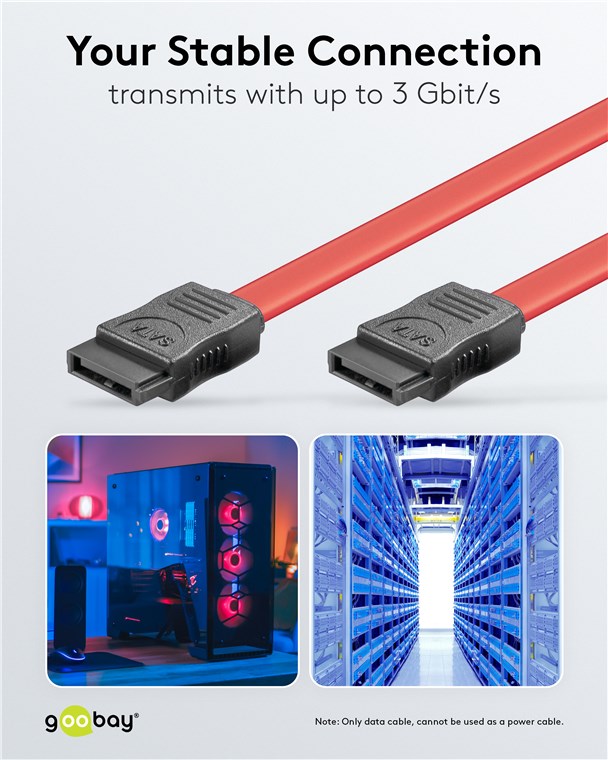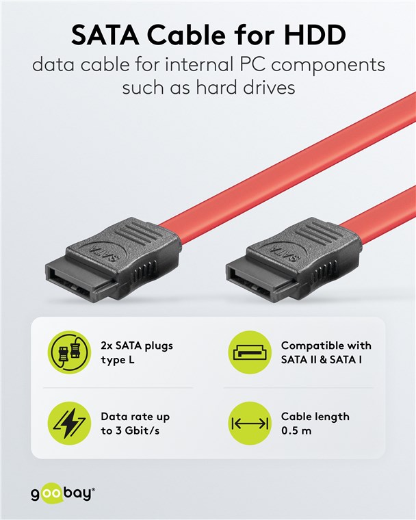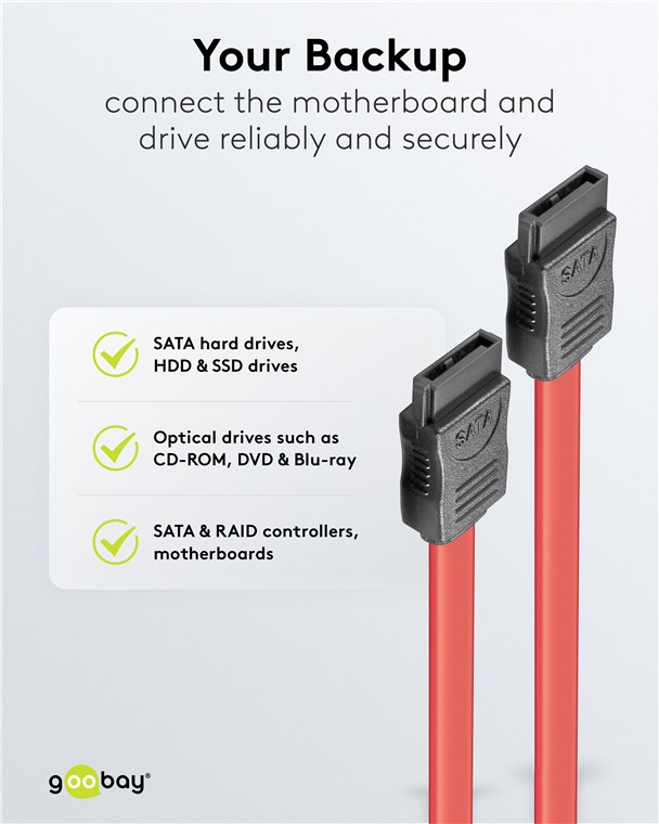 - Kabel SATA do podłączenia wewnętrznych dysków twardych, HDD, SDD, CD-ROM, DVD i Blu-ray do kontrolerów SATA, kontrolerów RAID lub płyt głównych