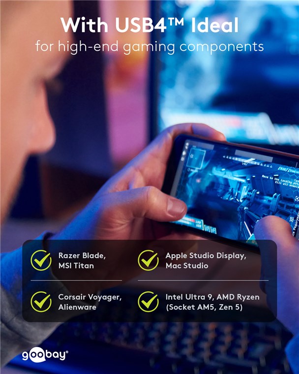 - USB4™ jest kompatybilny z wysokiej klasy komponentami do gier, np. Razer Blade 18, Corsair Voyager, Apple Studio Display lub procesorami AMD Ryzen (Zen 3+, Zen 5)