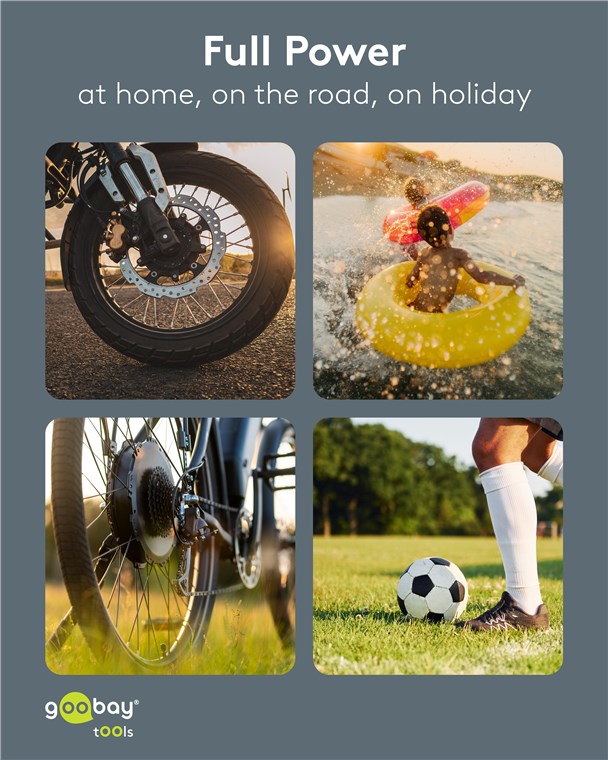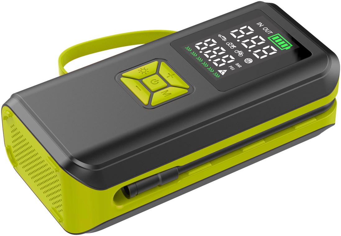 - Superelastyczna sprężarka powietrza: Z pięcioma różnymi trybami (auto, motocykl, rower, piłka, ustawienie indywidualne) i wskaźnikiem ciśnienia powietrza w psi lub barach