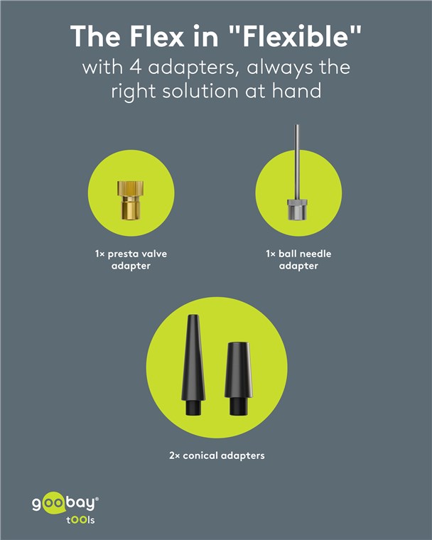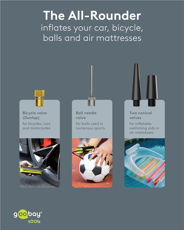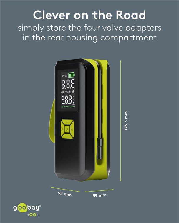 - Idealny jako urządzenie do pompowania opon w podróży: Cztery adaptery do zaworów są umieszczone w praktycznej przegródce z tyłu urządzenia