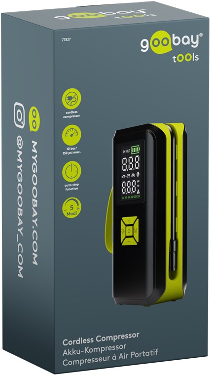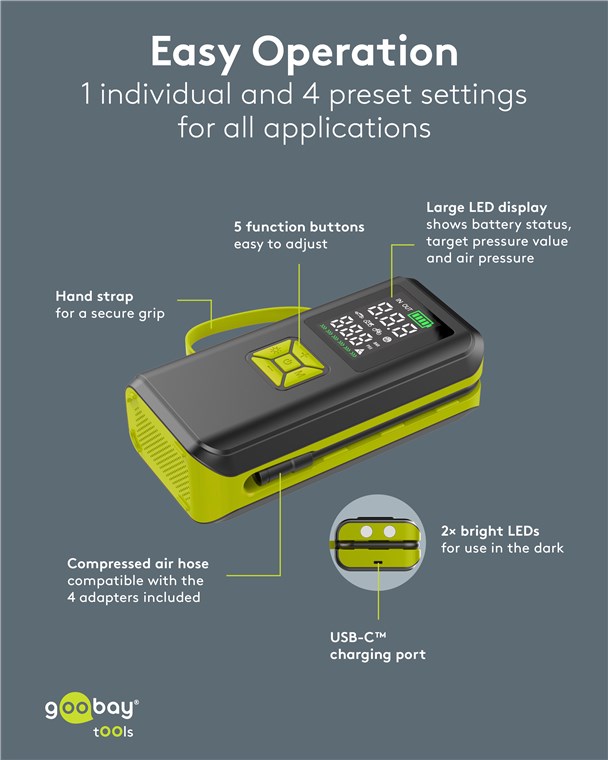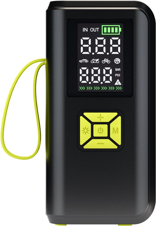 - Pełna wygoda: wygodna obsługa za pomocą pięciu przycisków i dużego wyświetlacza LED z wskaźnikiem stanu akumulatora, ciśnienia powietrza i docelowej wartości ciśnienia