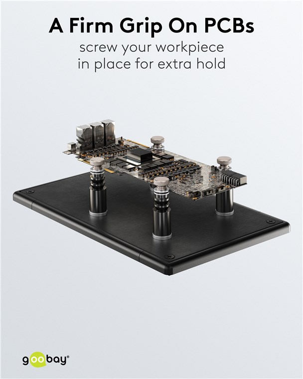 Niezawodne wsparcie dla obrabianego elementu: Mocne magnesy utrzymują płytkę drukowaną w miejscu, dzięki czemu można precyzyjnie umieścić nawet najmniejsze punkty lutownicze – bez ślizgania się i przesuwania. W przeciwieństwie do modeli z końcówkami, na których spoczywa płytka drukowana, ten model gwarantuje absolutnie bezpieczne mocowanie w bocznych wycięciach, szczególnie w przypadku lekkich i małych płytek drukowanych.