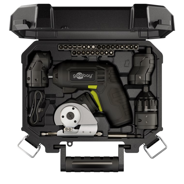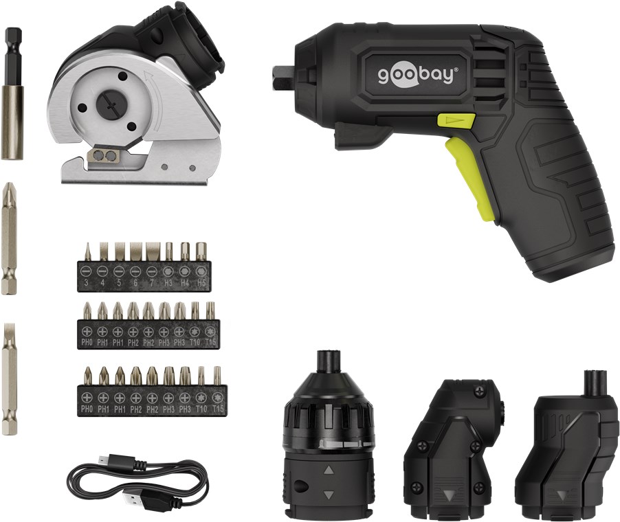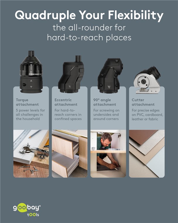 - 4 elastyczne nasadki do trudno dostępnych miejsc: 1x nasadka kątowa 90°, 1x nasadka mimośrodowa (uchwyt bitów ustawiony pod kątem do narożników), 1x nasadka z 5 stopniami momentu obrotowego, 1x uniwersalna nasadka tnąca