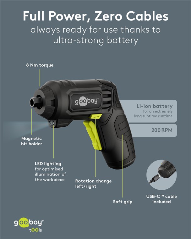 - W zestawie kabel USB-C™ do USB-A do ładowania akumulatora Li-ion, długość kabla 1,5 m