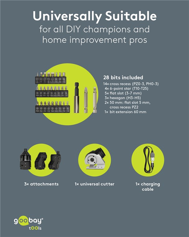27 bitów, 4 różne nasadki, kabel do ładowania USB-C™ na USB-A, przedłużka do bitów, pudełko do przechowywania, Wkrętarka akumulatorowa