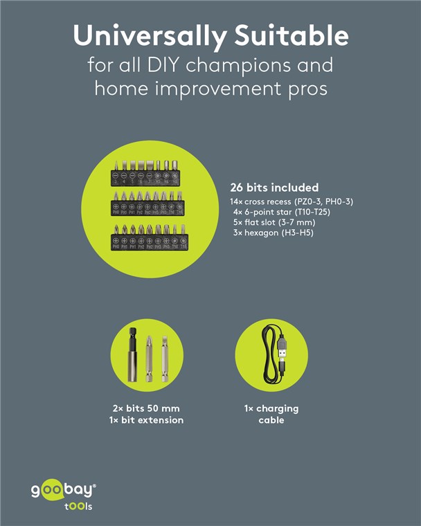 - W zestawie narzędzia: zestaw bitów z 14x krzyżowy (PZ0-3, PH0-3), 4x sześciokątny (T10-T25), 5x płaski (3-7 mm), 3x sześciokątny (H3-H5), 2x 50 mm płaski 5 mm/krzyżowy PZ2, 1x przedłużka do bitów, długość 60 mm