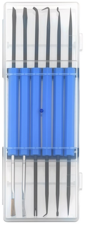 • 2x uchwyt chipów, 1x rozwiertak o okrągłym przekroju do czyszczenia otworów w płytkach, 1x dźwignia i 1x hak do wyjmowania elementów płytek, 2x ostry skrobak do usuwania korozji