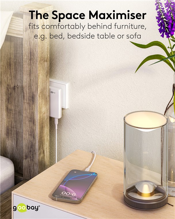 - Po podłączeniu do gniazdka ładowarka USB-C™ jest niewiele głębsza niż listwa przypodłogowa, dzięki czemu zajmuje bardzo mało miejsca – idealnie nadaje się do ciasnych pomieszczeń, np. za szafkami nocnymi i innymi meblami