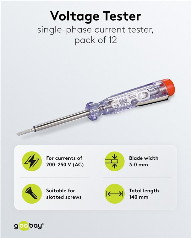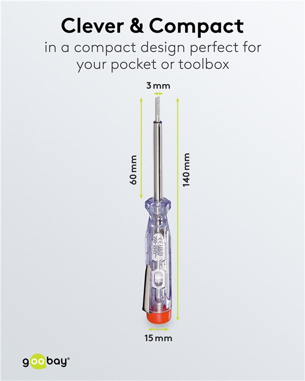• Wymiary testera fazy, szerokość grotu x długość trzonu: 3,0 mm x 60 mm, z klipsem kieszonkowym