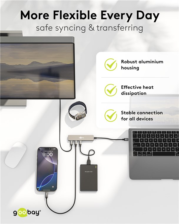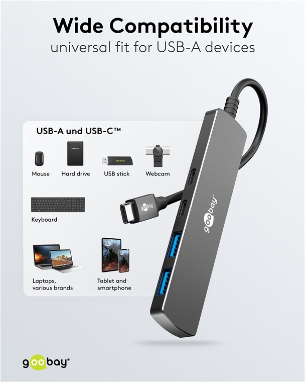 Maksymalna łączność dla każdego tabletu, smartfona lub laptopa za pomocą tylko jednego portu USB-C™: Smukły hub zwiększa liczbę portów, dostosowując je do wszystkich urządzeń USB-A i USB-C™, a jednocześnie zapewnia superszybką transmisję danych zgodnie ze standardem USB 3.2. Koniec z irytującym przełączaniem lub brakiem portów – praktyczny adapter wieloportowy jest idealnym rozwiązaniem dla wszystkich cyfrowych wyzwań.