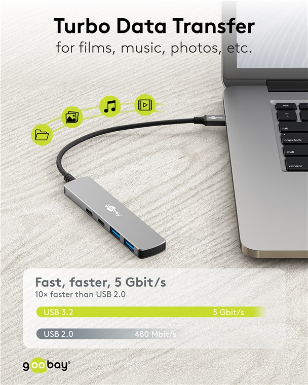 - Poprzez USB 3.2 adapter USB-C™ obsługuje prędkość transmisji danych SuperSpeed do 5 Gbit/s – idealnie nadaje się do przesyłania dużych plików, takich jak filmy, wideo lub nieskompresowane pliki audio