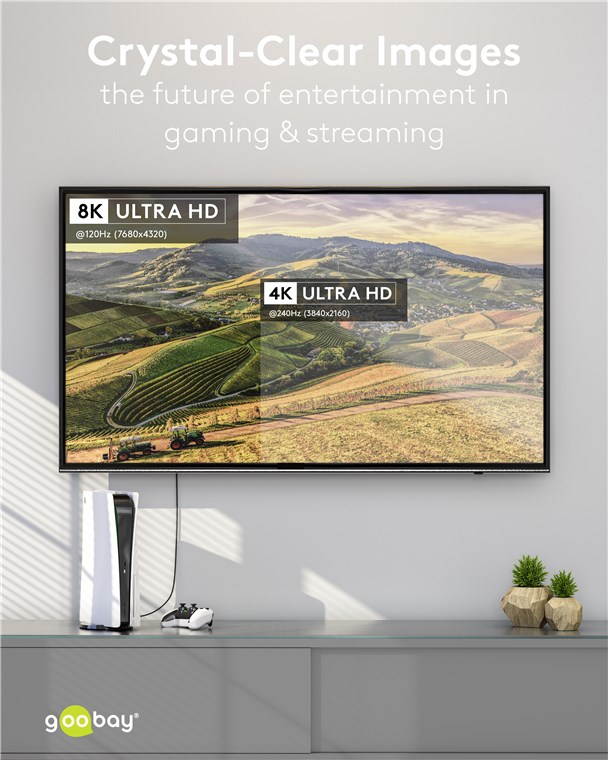 - Kabel 8K specjalnie do gier. Płynny obraz bez efektu smużenia dzięki wysokiej częstotliwości odświeżania wynoszącej do 240 Hz (w zależności od karty graficznej i monitora)