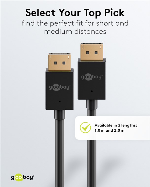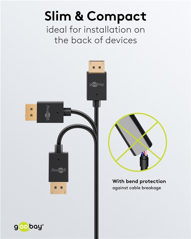 Kabel DisplayPort™ imponuje na trzy sposoby: ultra cienki kabel, ultra krótkie złącza i ultra wąski promień gięcia. Te trzy czynniki sprawiają, że kabel jest idealny do instalacji z tyłu urządzeń i wszędzie tam, gdzie przestrzeń jest ograniczona. Dzięki ultrawysokiej rozdzielczości obrazu 8K zapewniającej ostry jak brzytwa obraz i funkcji wielu monitorów o wysokiej częstotliwości, kabel DisplayPort™ jest idealnym wyborem do wciągających gier i wciągającej domowej rozrywki.