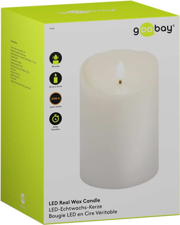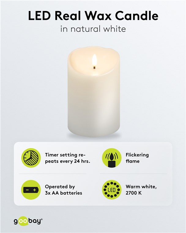 - Stylowa świeca filarowa z pokrywą z prawdziwego wosku zapewniająca ciepłe światło świecy z naturalnie wyglądającym, migoczącym płomieniem – całkowicie elektryczne i całkowicie bezpieczne