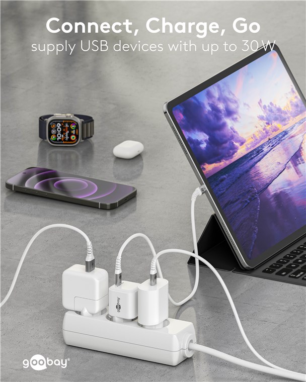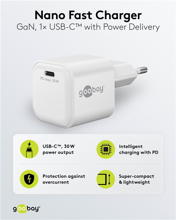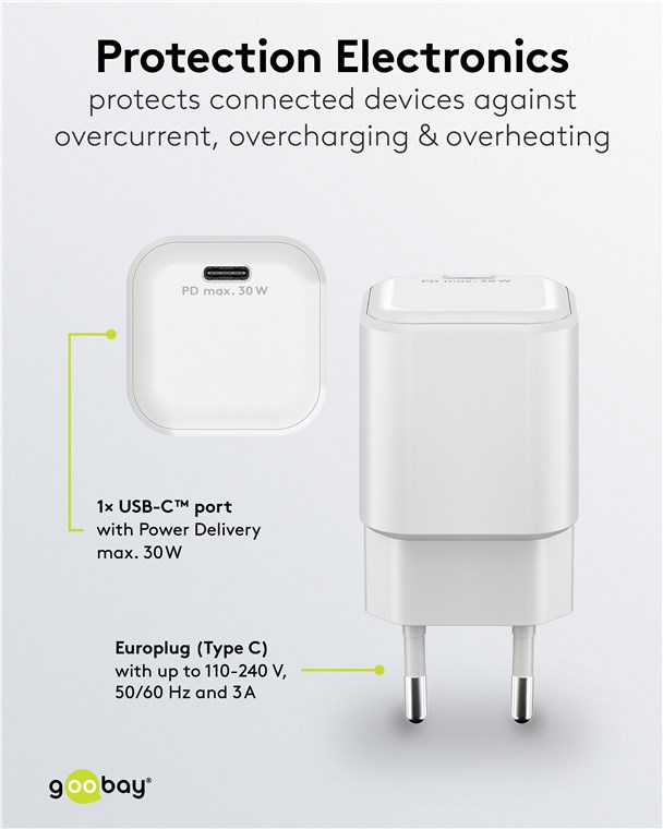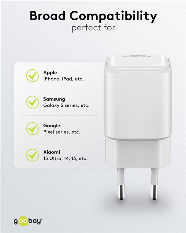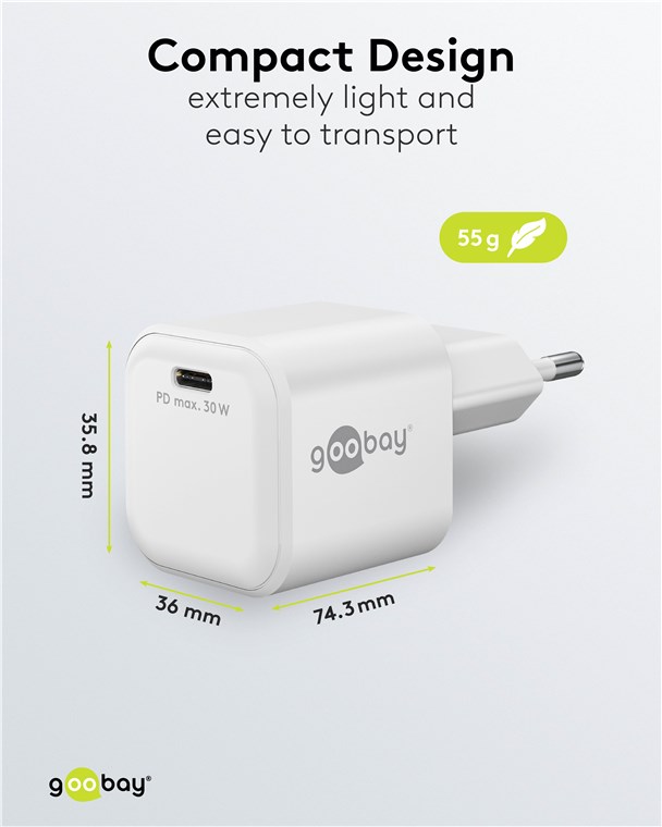 - Moc 30 W sprawia, że adapter do ładowania jest specjalnie dostosowany do małych urządzeń, takich jak smartfony, słuchawki Bluetooth, tablety czy powerbanki