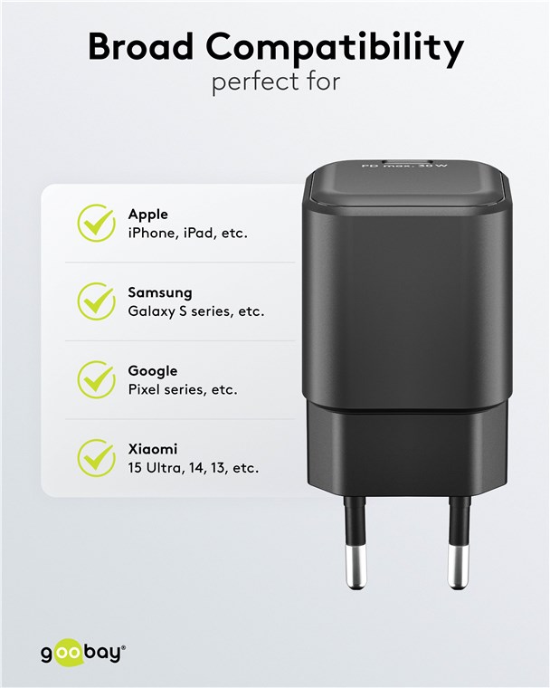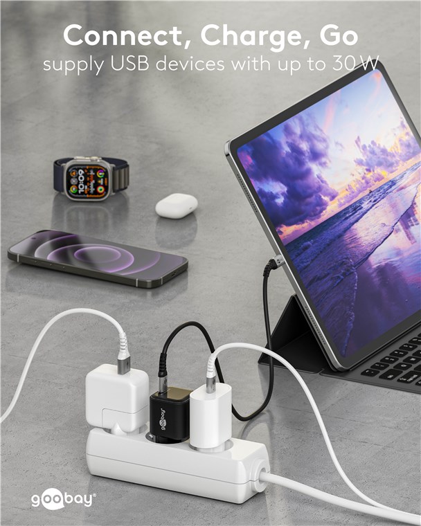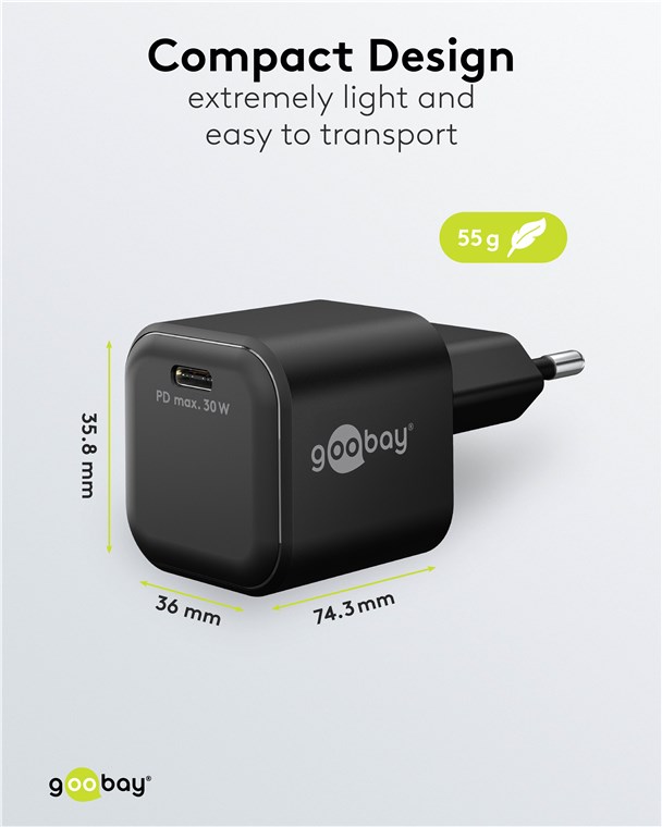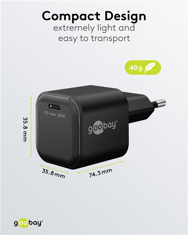 - Moc 30 W sprawia, że adapter do ładowania jest specjalnie dostosowany do małych urządzeń, takich jak smartfony, słuchawki Bluetooth, tablety czy powerbanki