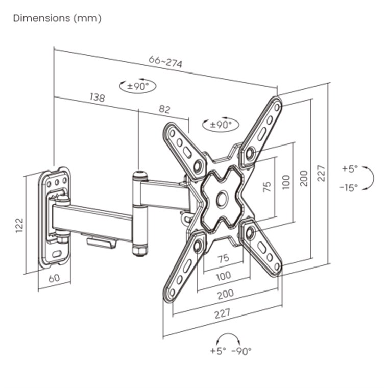- Elastyczny uchwyt telewizyjny zapewniający optymalny kąt widzenia: możliwość pochylenia w zakresie od +5° do -15° (w górę/w dół), obrotu w zakresie od +60/-60° (w lewo/w prawo), obrotu w zakresie od +5° do -90° oraz wysunięcia na odległość 27,4 cm