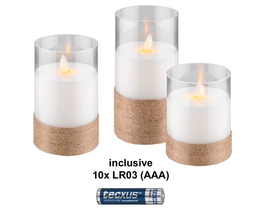 Trzyelementowy zestaw świec LED z prawdziwego wosku w szklance, biały, owinięty konopiami, z 8x AA (LR6)