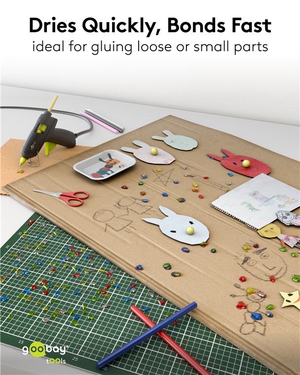 • Klej na gorąco szybko schnie, dzięki czemu jest szczególnie wygodny do przyklejania luźnych lub małych elementów