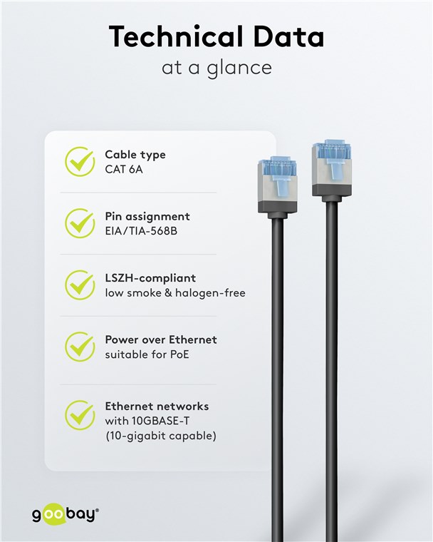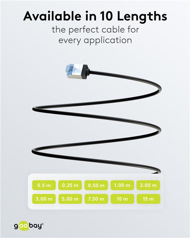 - Supercienki kabel LAN z bardzo krótkimi złączami RJ45 zapewnia mniejszą objętość kabla w szafie serwerowej lub panelu krosowym, a tym samym optymalną cyrkulację powietrza