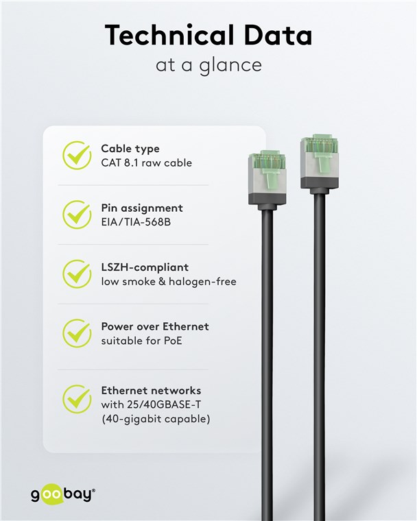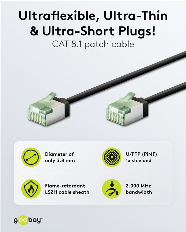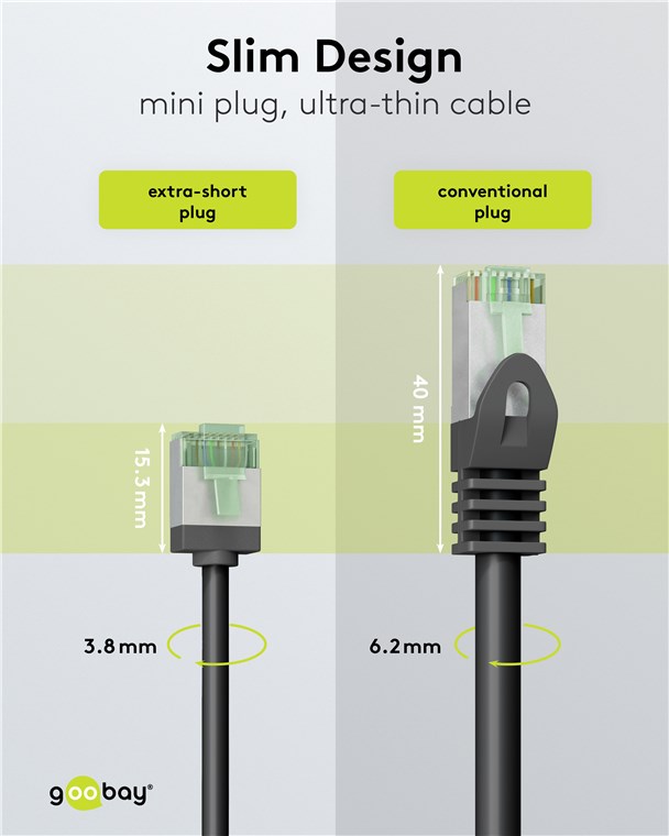 - Supercienki kabel LAN z bardzo krótkimi złączami RJ45 zapewnia mniejszą objętość kabla w szafie serwerowej lub panelu krosowym, a tym samym optymalną cyrkulację powietrza
