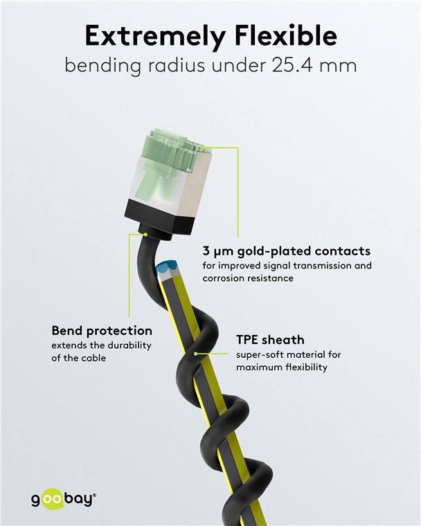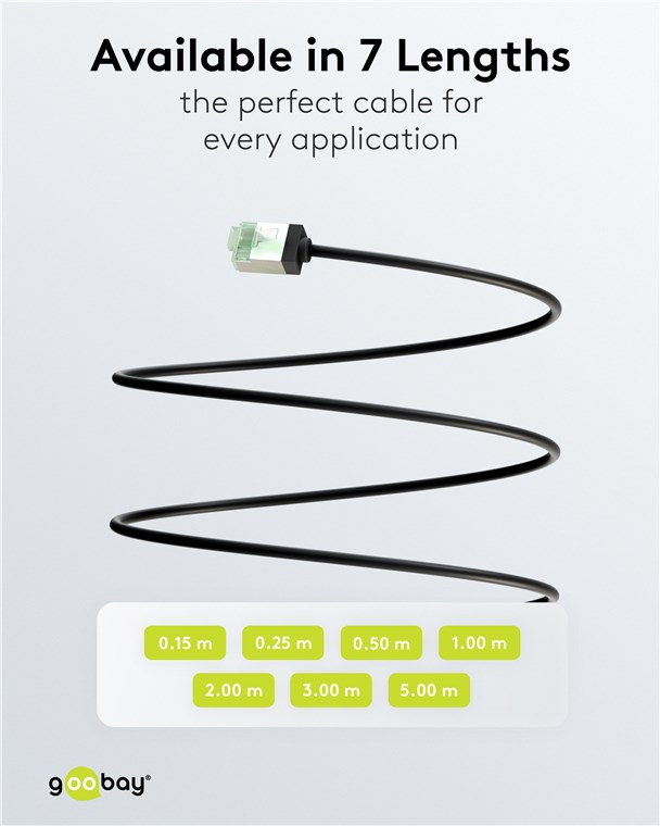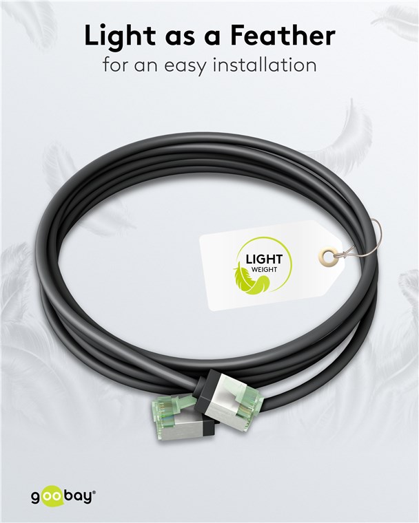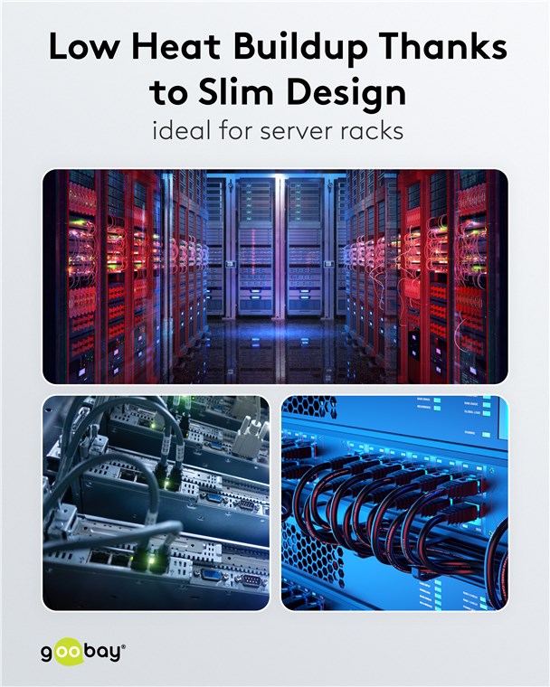CATegoria sama dla siebie: Super cienkie kable CAT z bardzo krótkimi złączami drastycznie zmniejszają objętość materiału w szafach serwerowych i panelach krosowych - dla znacznie lepszej cyrkulacji powietrza i mniejszego gromadzenia się ciepła niż w przypadku konwencjonalnego okablowania. Ponadto, miękki płaszcz TPE i cienkie miedziane przewodniki zapewniają wyjątkową elastyczność i wydajność materiałową, które sprawiają, że ta generacja kabli jest idealnym partnerem sieciowym.