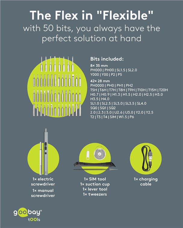 8× 35 mm bitów, kabel do ładowania USB-C™ na USB-A, pęseta, pin, przyssawka, pudełko do przechowywania, Śrubokręt ręczny i dźwignia, Uchwyt śrubokręta z magnetycznym mocowaniem, v