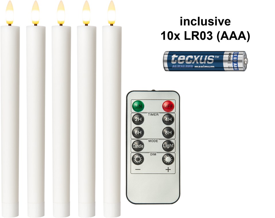 • Wymiary (Ø x wys.): 2,0 x 25,0 cm, każda świeca LED zasilana 2 bateriami AAA (w zestawie), pilot: 1x CR2025 (dołączona)