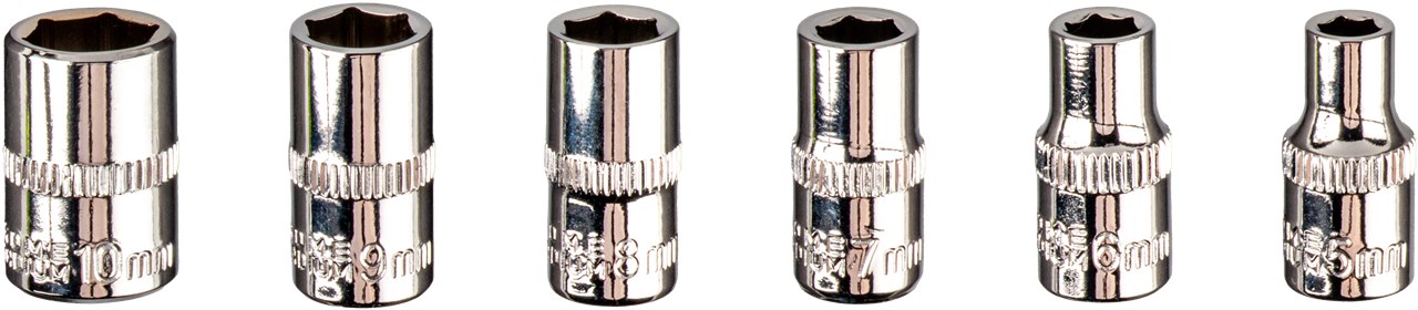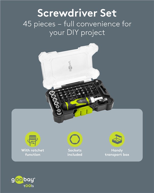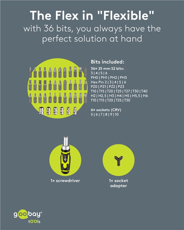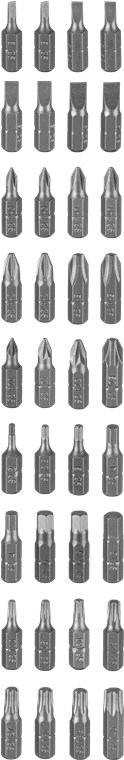 - W zestawie 1x adapter do klucza nasadowego, 6x kluczy nasadowych (5–10 mm, CRV) i 36 bitów z odpornej na uderzenia stali S2: 4x płaski, 8x krzyżakowych (PH, PZ), 12x sześciokątny (H, Hex Pin), 12x sześciokątny (T, TH)