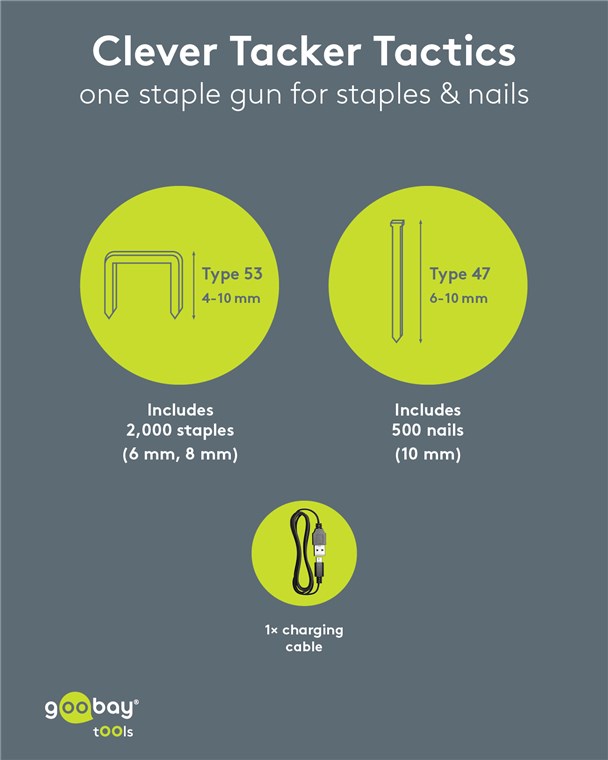 1000 zszywek (6 mm), 1000 zszywek (8 mm), 500 gwoździ (10 mm), kabel do ładowania USB-C™ na USB-A